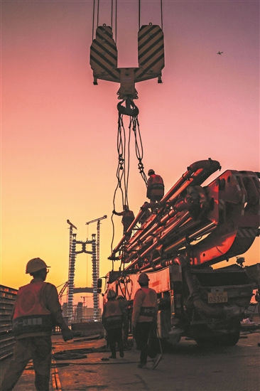 1月14日傍晚,在厦金大桥海上作业平台东主塔下,工人们配合塔吊,转运混凝土泵车。