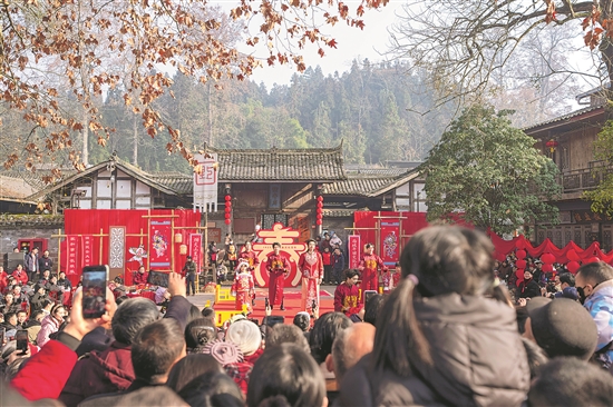 当日,雅安市雨城区2026年年猪文化旅游系列活动在上里古镇举行。活动现场推出“喜宴+年猪”剧目演绎,配合民俗文化巡游、非遗展演、吃坝坝宴等活动,让市民游客提前感受浓浓年味。