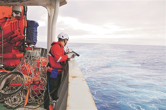 船时1月16日, “雪龙”号大洋队队员手持发射器,向海中投放抛弃式温深仪。此次考察队伍由来自国内12家科研院所及高校的31人组成,将在阿蒙森海及邻近海域的大洋重点开展海洋生态系统关键要素调查。新华社记者 顾天成 摄