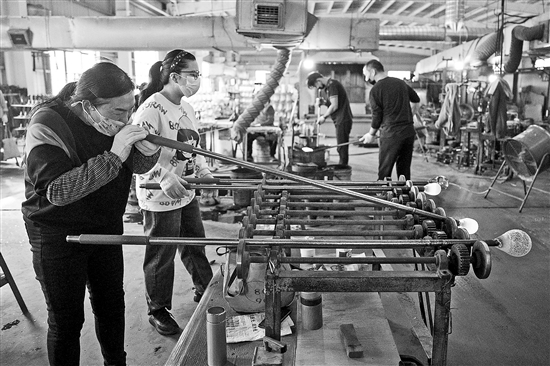 1月14日,在安徽省天长市石梁镇石峰玻璃有限公司工厂,工人在制作水烟壶。