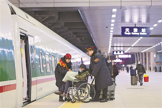 1月19日,铁路工作人员在天津站服务重点旅客上车。