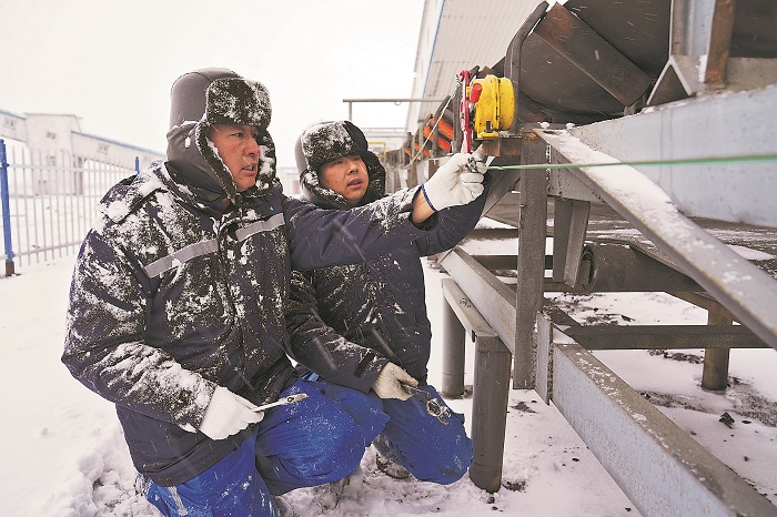 1月13日,大雪致中煤华利和翔公司别斯库都克露天煤矿全面停产。该矿生产维修班在零下20摄氏度严寒中,冒雪开展坑下主皮带运输系统维护,现场更换拉绳保护装置。李磊 摄
