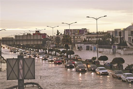 据突尼斯非洲通讯社报道,当地时间1月19日晚至20日,突尼斯多地遭遇强对流天气,带来的强降雨引发洪灾,已造成4人死亡。图为当地时间1月20日,在突尼斯首都突尼斯市,车辆涉水通行。