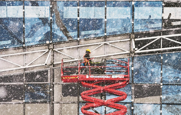 在该市兰山区体育中心项目建设工地,寒风与飞雪并未阻挡建设者的脚步,农民工、技术人员、监理人员坚守岗位,全力以赴推进项目建设,在风雪中勾勒出一幅拼搏奋进的动人图景。
