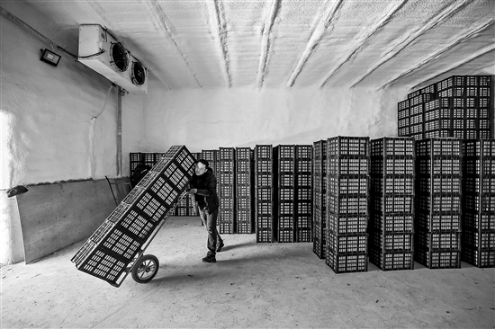 1月20日,村民在辽宁省葫芦岛市绥中县明水满族乡祝家沟村新建的恒温库内搬运水果。