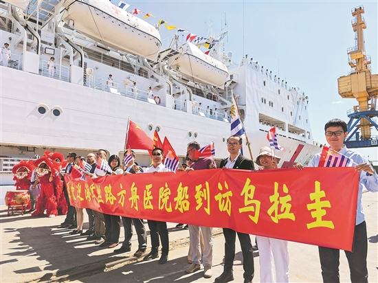 近日,中国海军“丝路方舟”号医院船抵达乌拉圭蒙得维的亚港,进行为期4天的技术停靠。这是中国海军舰艇首次停靠乌拉圭。停靠期间,“丝路方舟”号医院船除进行适当补给外,还计划组织足球友谊赛等活动。图为码头欢迎仪式。新华社发(崔晓洋 摄)
