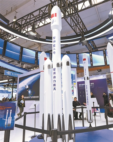 1月23日,观众在2026北京国际商业航天展的星河动力航天展台参观展出的火箭模型。