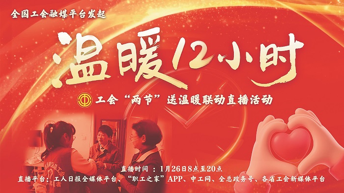 1月26日上午8时起,全国工会融媒平台将发起持续12小时的直播活动,在北京设置主直播间,与您一起感受这份寒冬里的暖心、暖情、暖意,带您直击送温暖行动现场,聆听藏在关怀里的动人故事。