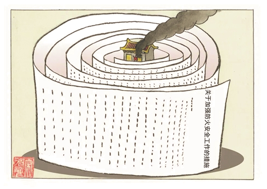 工作都做到这份儿上了,按理说应该高枕无忧了,可人们还是发现,老房子冒烟了,明火也在黑烟下方窜来窜去。看来这一圈一圈的“措施”,还是没能镇得住火险。正如这幅作品标题告诉我们的,这张“纸”还是没能包得住“火”。可以想象,火冒三丈的上级领导,免不了还要进行严肃追责。