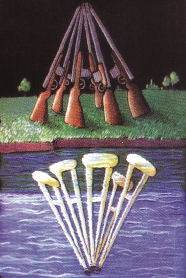 枪炮往往和杀戮、硝烟联系到一起,其倒影即是令人沮丧的影像。善良的人们多么渴望世界无战事、人间无血腥!
