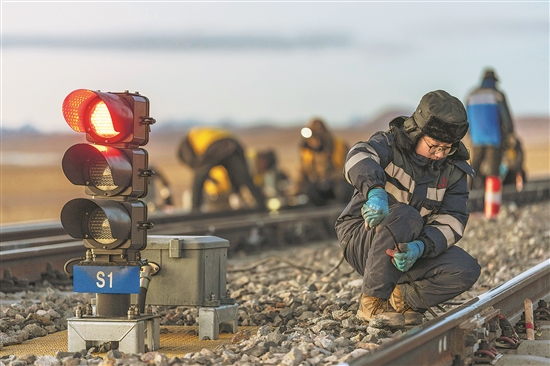 海拔4886米的扎加藏布信号工区,坐落于西藏那曲市安多县岗尼乡,是世界上海拔最高的铁路信号工区。1月23日,扎加藏布信号工区信号工成格乐在整治轨道电路箱盒引接线。