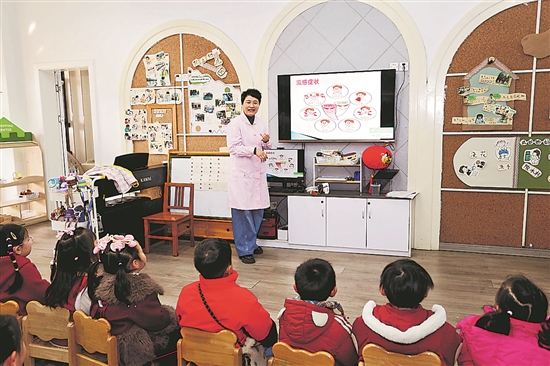 医护团队针对幼儿生长发育特点,量身打造了预防感冒趣味科普课堂,以通俗语言讲解冬季常见病预防、合理膳食、科学作息等知识,通过“健康小问答”互动游戏,孩子们在欢声笑语中掌握健康常识。本报通讯员 单明铭 摄