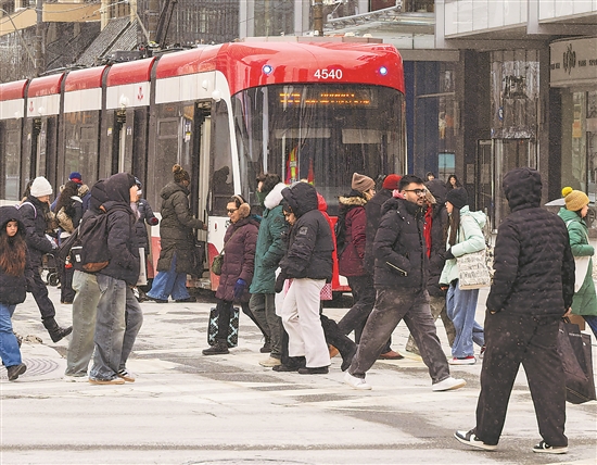 近日,加拿大多伦多遭遇极寒天气,风寒效应下体感温度接近零下33摄氏度。图为近日人们于严寒天气中在加拿大多伦多出行。新华社发 (邹峥 摄)
