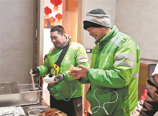 时针走过中午12时,前来就餐的户外劳动者越来越多。驿站的门不时被打开,带进一缕缕冬日的寒风,又很快消融在饭菜的热气与小哥们的笑语中。