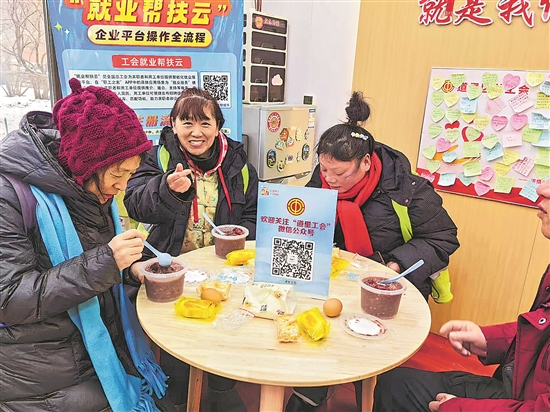 ②北京朝阳区工人文化宫职工之家,劳动者在吃水饺、喝腊八粥。朝阳区总工会供图
