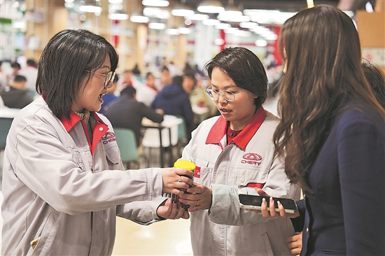 ⑧安徽芜湖奇瑞集团厂区,两名职工刚领到腊八粥。记者 陈华 通讯员 郑欢 摄
