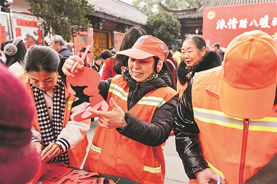 “古城人气越来越旺,忙碌的户外劳动者反而很少能参与到热闹的春节活动中。”阆中市总工会副主席曹锋称,环卫工人、外卖配送员、快递小哥等,每天穿梭在大街小巷,是服务城市文旅发展的重要力量,所以今年的送温暖活动,专门在古城内开展,不仅准备了暖心的腊八粥,还结合“年”文化设置了多种非遗体验环节。