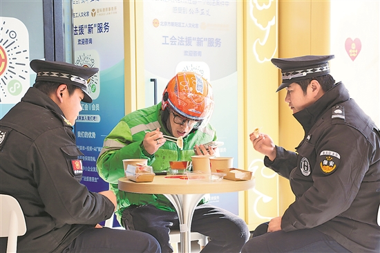 热气腾腾的餐食,暖胃更暖心。外卖小哥捧着粥碗,喝上一口后眉眼间满是感动:“喝一碗腊八粥,心里一下子就暖透了。”保洁阿姨坐在休息区品尝饺子,眼眶微微发热:“这就是家里的味道,没想到工会惦记着我们,太感动了。”