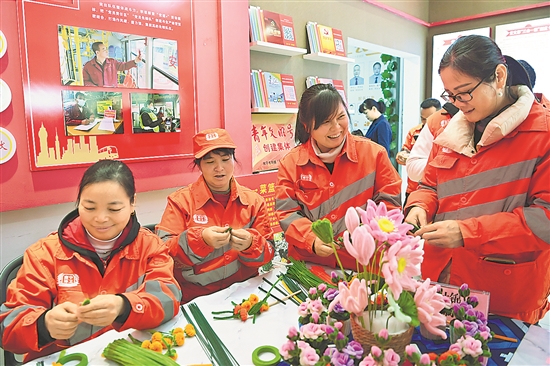 ⑦南宁市青秀区环卫女工们正在制作壮锦香囊。胡东宇 摄