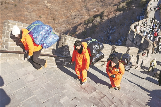 1月23日,本报记者秦亦姝(左一)与八达岭长城景区的环卫工一起背着垃圾前行。本报记者 王伟伟 摄