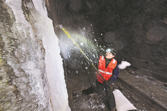 1月27日,山西省太原市太焦铁路石会一号隧道内,国铁太原局太原工务段榆社桥隧车间石会打冰点的桥隧工们正紧张作业。