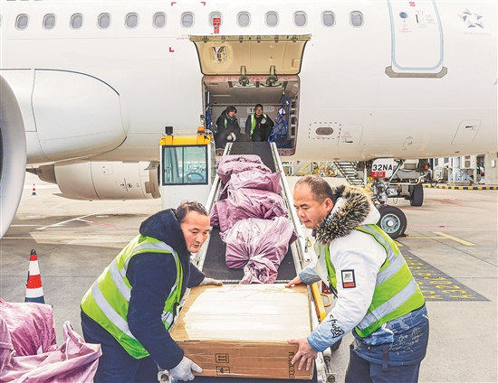 1月28日,装卸人员在扬州泰州国际机场装卸货物。