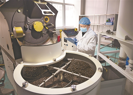1月27日,在河南濮阳县的中国(濮阳)埃塞咖啡产业示范园烘焙车间,工作人员在记录咖啡豆烘焙数据。