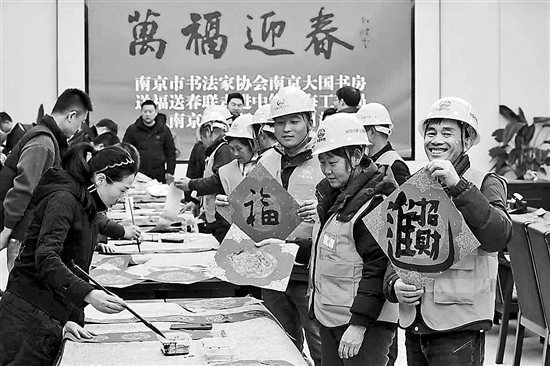 该活动由中铁上海局南京上元门房建项目部联合永宁街道派出所和书法家协会共同举办。书法家们铺纸研墨、现场挥毫,一幅幅饱含吉祥寓意、融入工程特色的福字和春联,在工人们手中传递。本报通讯员 武晓文 夏冰 摄