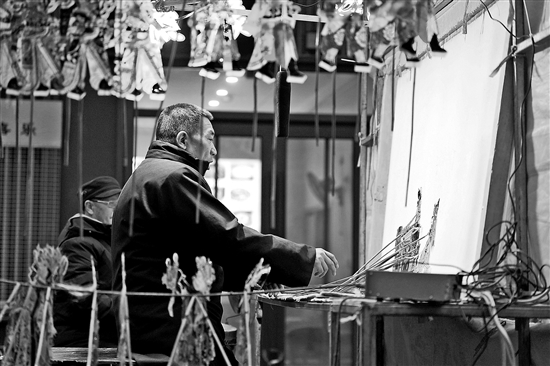1月25日,河湟皮影戏国家级非物质文化遗产代表性传承人周邦辉在青海省西宁市城北区表演皮影戏,这已是他和皮影社今年在西宁“进城”演出的第5场。