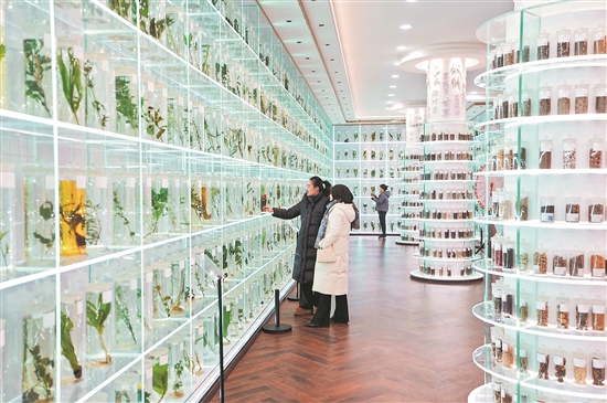 1月26日,游客在宁夏固原市隆德县中医药科普体验馆内参观。