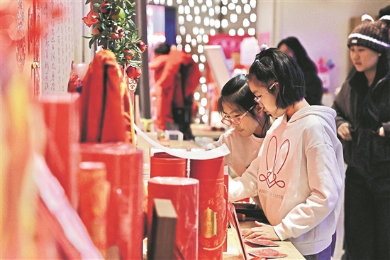 1月25日,北京市魏公·芳华里商街国图文创馆里的顾客争相选购新年礼包,迎春氛围浓郁。国图文创馆以典籍文化为灵感源泉,将传统吉祥寓意巧妙融于现代审美设计,精心推出的“食来运转”新年礼盒,让古老智慧映照佳节日常,用书香雅意装点中国年。在一步一典籍,一隅一惊喜的空间里,公众在选购好物的同时,沉浸式感受中华文脉的深厚底蕴,让典籍文化以鲜活的形式走进日常。
