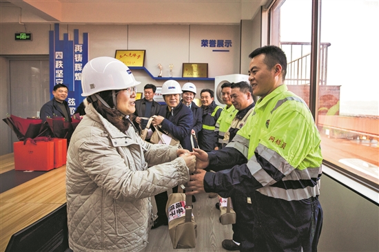 1月13日,浙江省总工会工作人员在宁波舟山港北仑港区矿石码头,为卸船机班一线员工送上“暖冬礼包”。本报通讯员 蒋晓东 摄