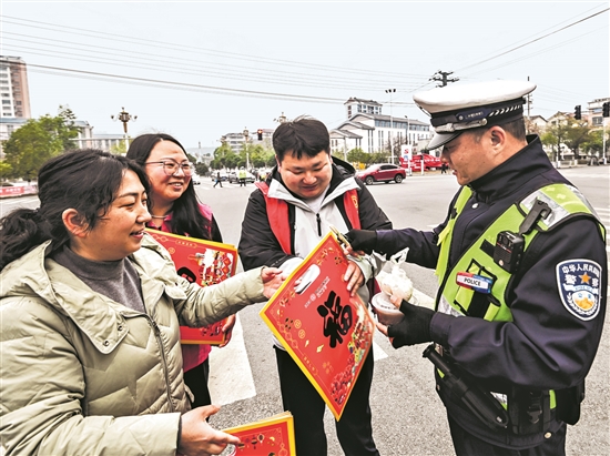 1月26日,江西省资溪县总工会志愿者为执勤交警送上腊八粥。本报通讯员 吴志贵 摄