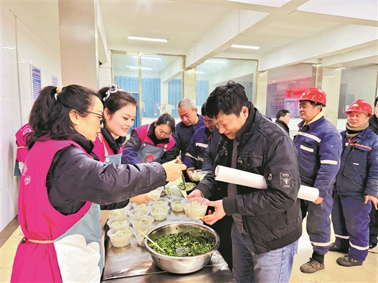1月23日,安徽淮北矿业集团朱仙庄矿,企业工会组织协安员在井口休息室为职工送上热气腾腾的水饺。本报通讯员 王道玉 摄
