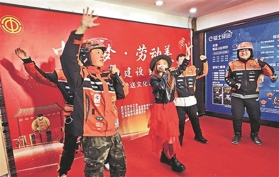 1月28日,湖北省武汉市淘宝闪购红旗渠路工会驿站,女声独唱演员与江城骑侠志愿者互动。本报通讯员 李长林 摄