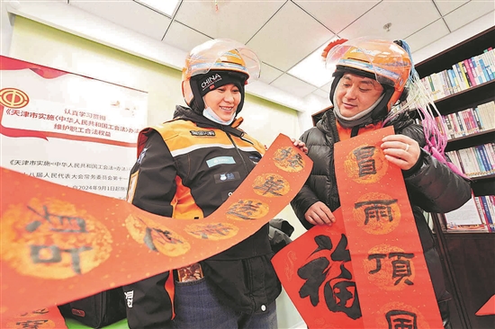 1月26日,天津市河西区职工服务中心工会驿站,河西区总工会工作人员向新就业形态劳动者赠送福字和春联。本报通讯员 沈岳 摄