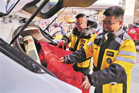 1月15日,河北秦皇岛,网约配送员领取工会慰问品。 本报通讯员 曹建雄 摄