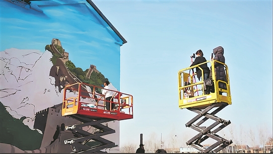 记者见到吴承言时,他正站在4米多高的升降梯上,在一面农家院的外墙上进行“长城”的墙绘。身着迷彩棉服的他袖子沾满颜料,把手机固定在手腕上以便对照造型和颜色,视线在屏幕与墙面间来回切换。看似随意的几笔涂抹后,“城墙”的蜿蜒起伏已跃然墙上。