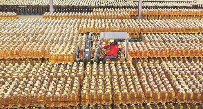 2月1日,在位于江苏省海安高新区的一家企业内,工人在装运食用油供应市场。