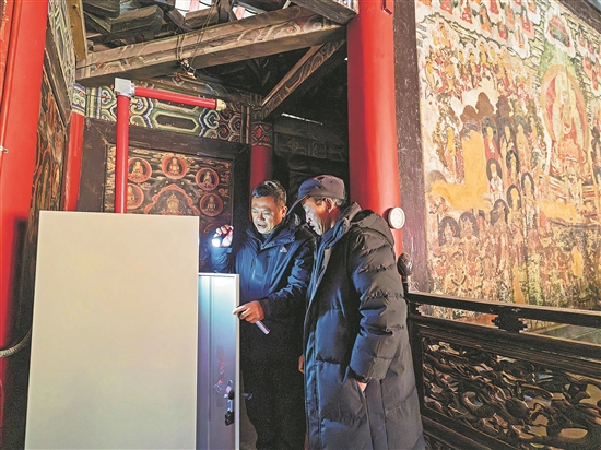 1月15日,杨志坚(左)与同事在白沙壁画博物馆检查大宝积宫消防设施。