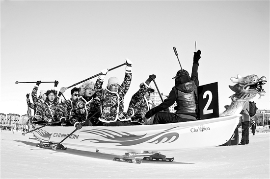 2月2日,内蒙古锡林浩特市锡林湖冰场,中外选手在冰上龙舟100米直道赛中激烈角逐。当日,五大洲冰上龙舟挑战赛在此举行,来自全球21个国家和地区的近600名运动员参赛,赛事融合冰雪运动与传统文化,助力当地冰雪经济发展。视觉中国 供图