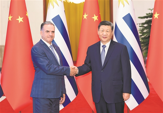 习近平指出,当今世界正处于百年未有之大变局,国际形势变乱交织,单边霸凌愈演愈烈,中方支持乌拉圭接任“77国集团和中国”轮值主席国,愿与乌方加强全球南方团结协作,共同推进平等有序的世界多极化、普惠包容的经济全球化,携手并进、共谋发展,为构建人类命运共同体作出更大贡献。中方始终重视中拉关系,支持拉美和加勒比国家维护自身主权、安全、发展利益,支持乌拉圭接任拉美和加勒比国家共同体以及南方共同市场轮值主席国,愿同乌方和地区国家推动共建中拉命运共同体走深走实。