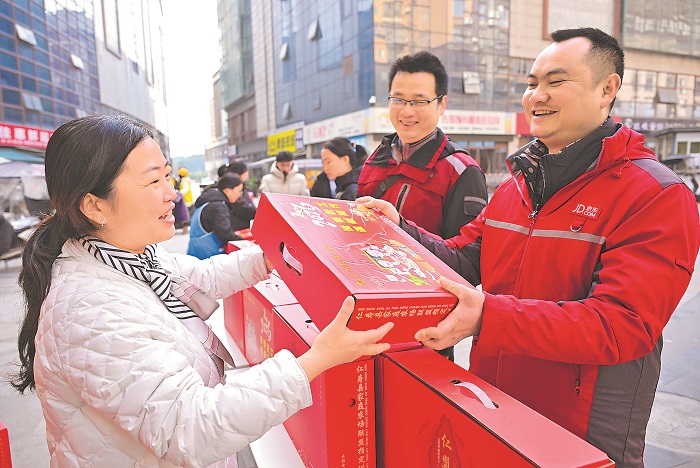 2月3日,在四川省眉山市仁寿县城区的职工之家门前,县总工会工作人员向新就业形态劳动者集中送年货礼包。