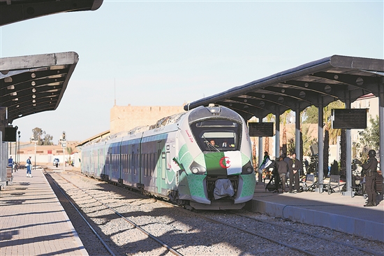 近日,在阿尔及利亚贝沙尔省举办的该国西部铁路矿业线项目通车仪式上,一辆列车停靠在站台上。新华社发