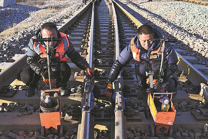 为及时发现断轨隐患,确保运输安全,连日来,中国铁路太原局集团有限公司原平工务段组织工作人员对韩原线、北同蒲线等13个站区钢轨焊缝进行探伤作业。通过探头对焊缝轨头、轨腰、轨底实施全断面扫查,全面检测焊缝内部质量,为春运期间列车运行安全稳定提供了有力的设备保障。