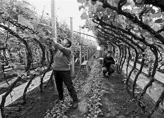 2月4日,海港经济开发区王滩镇的农民在管护大棚葡萄。