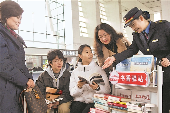 春运期间,中国铁路上海局集团有限公司镇江站迎来了返乡过年的客流,车站因地制宜推出绿色通道、免费充电、解答问询、便捷换乘引导、关爱重点旅客等服务措施,为旅客送上暖心服务。图为在“润之舟”雷锋服务站工作人员为旅客送上精美图书,增加“文化充电”,在旅途中静心阅读,充满浓浓的书馨。