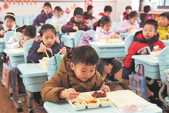 在上海市普陀区长征镇办班点,寒托班的小学生在用午餐。