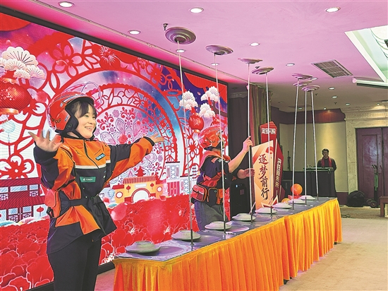 2月9日,由陕西省财贸金融轻工工会等主办,西安市碑林区文艺路街道总工会等承办的“福气加‘马’ 共启新‘橙’”——迎新春送温暖暨2026城市骑士新春联欢会举办,200余名春节期间坚守岗位的骑手及其子女参加。活动现场举办了“城市骑士集体生日会”“驿路留影 马上有福”“灯谜擂台 骑开得胜”等活动。图为骑手登台为大家表演杂技。本报记者 祝盼 毛浓曦 摄