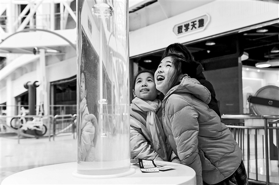 2月6日,小朋友在江苏泰州科技馆体验科学实验装置。